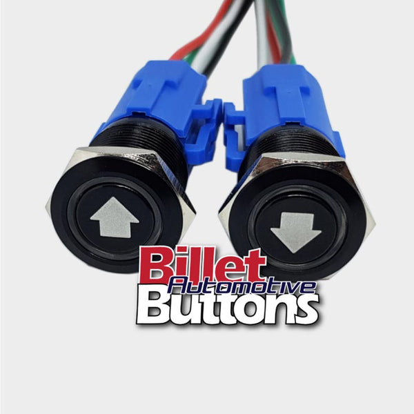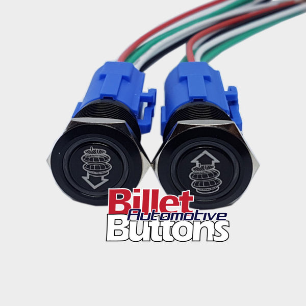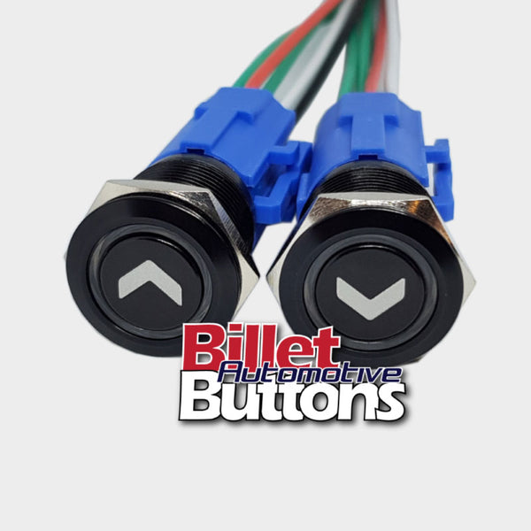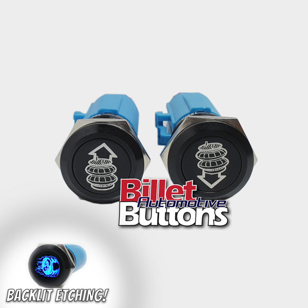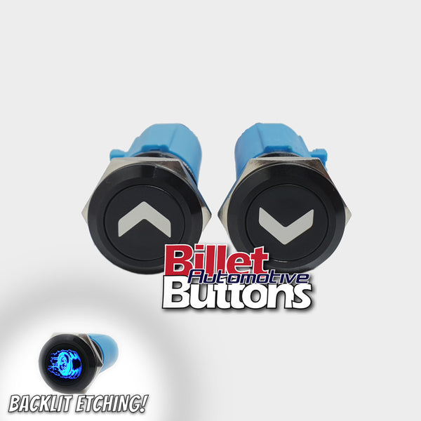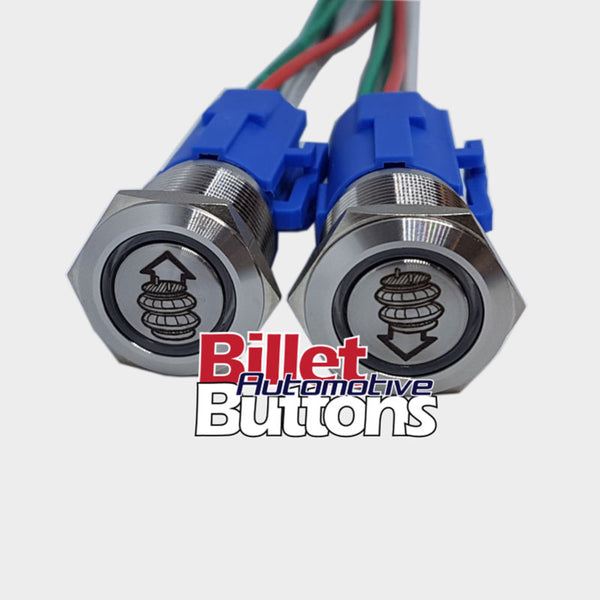 19mm Pair 'AIRBAG SUSPENSION SYMBOLS' Billet Push Buttons Switches Up Down air