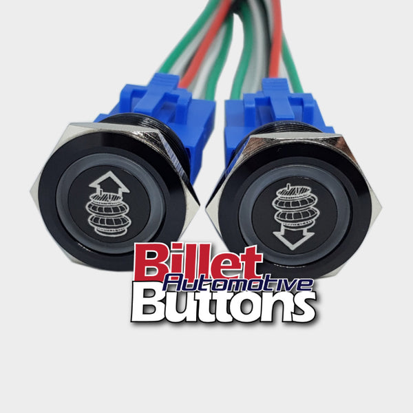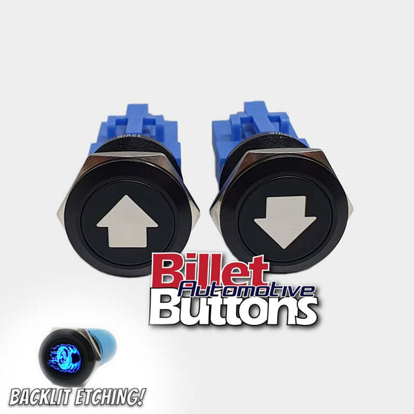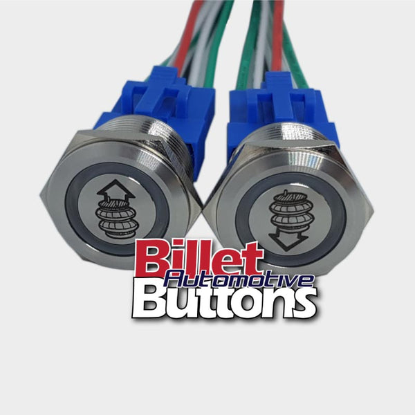 22mm Pair 'AIRBAG SUSPENSION SYMBOLS' Billet Push Buttons Switches Up Down air