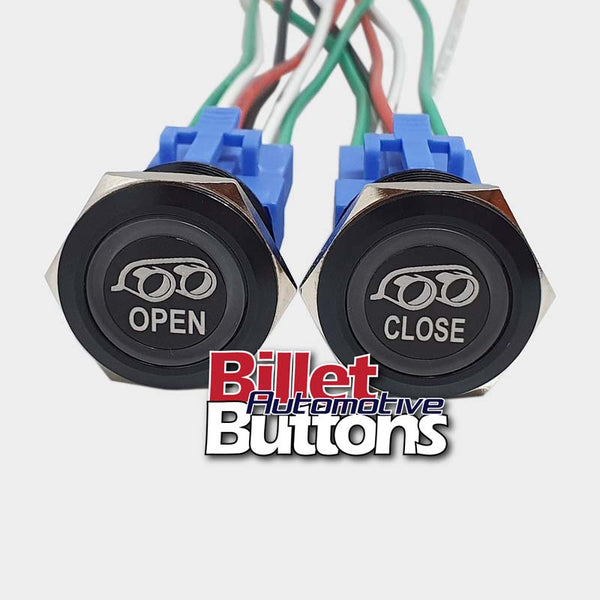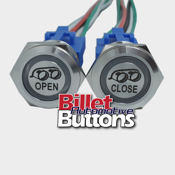 22mm Pair 'EXHAUST OPEN/CLOSE' Billet Push Buttons Switches Electric Cutouts