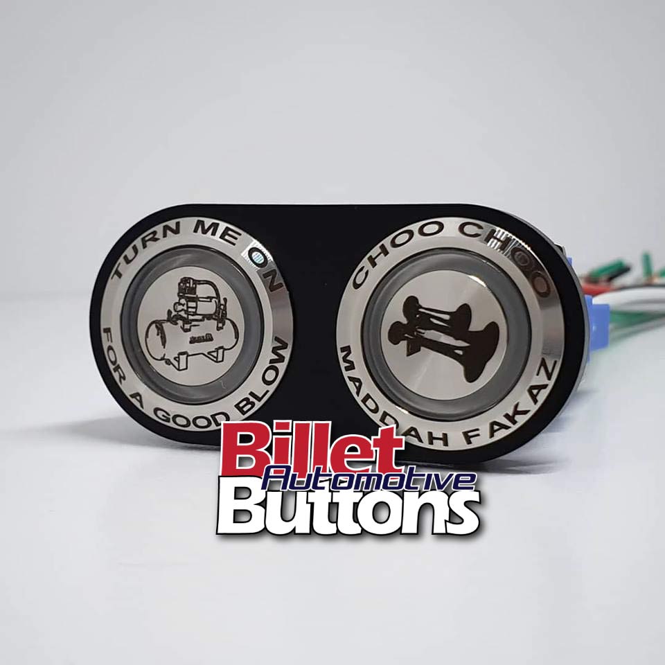 Train Horns Pair Special 2x 22mm laser etched billet buttons as shown - latching compressor button & Momentary horn button with black anodized mounting plate. (leave a note if you want buttons to have 2x different colors)